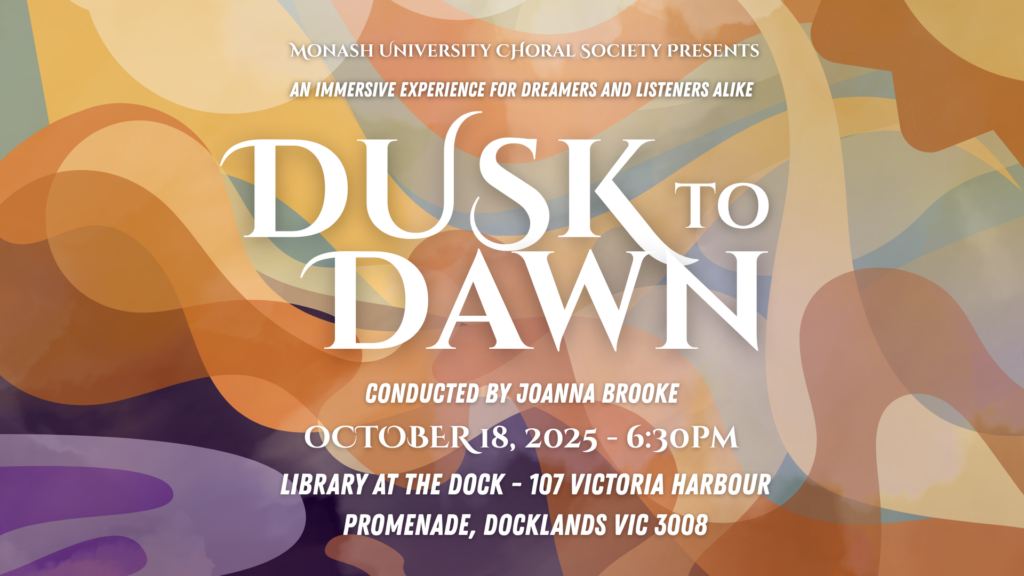 The Monash University Choral Society is excited to present our second concert for 2025: Dusk ’til Dawn – An immersive experience for listeners and dreamers alike.